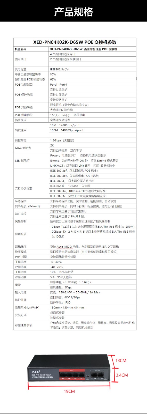 XED-PN04K02K-D65W是一款高性能的百兆POE交換機(jī),可通過網(wǎng)線為無線AP,攝像頭等PD設(shè)備提供最大單端口30W供電,支持一鍵開啟網(wǎng)絡(luò)延長模式,突破網(wǎng)線百米限制,有效滿足遠(yuǎn)距離供電布線傳輸需要;完全滿足新一代組網(wǎng)需求,適用家庭,酒店,中小企業(yè)等各類場景;為您構(gòu)建更安全、更快速、可增值的可靠網(wǎng)絡(luò)。