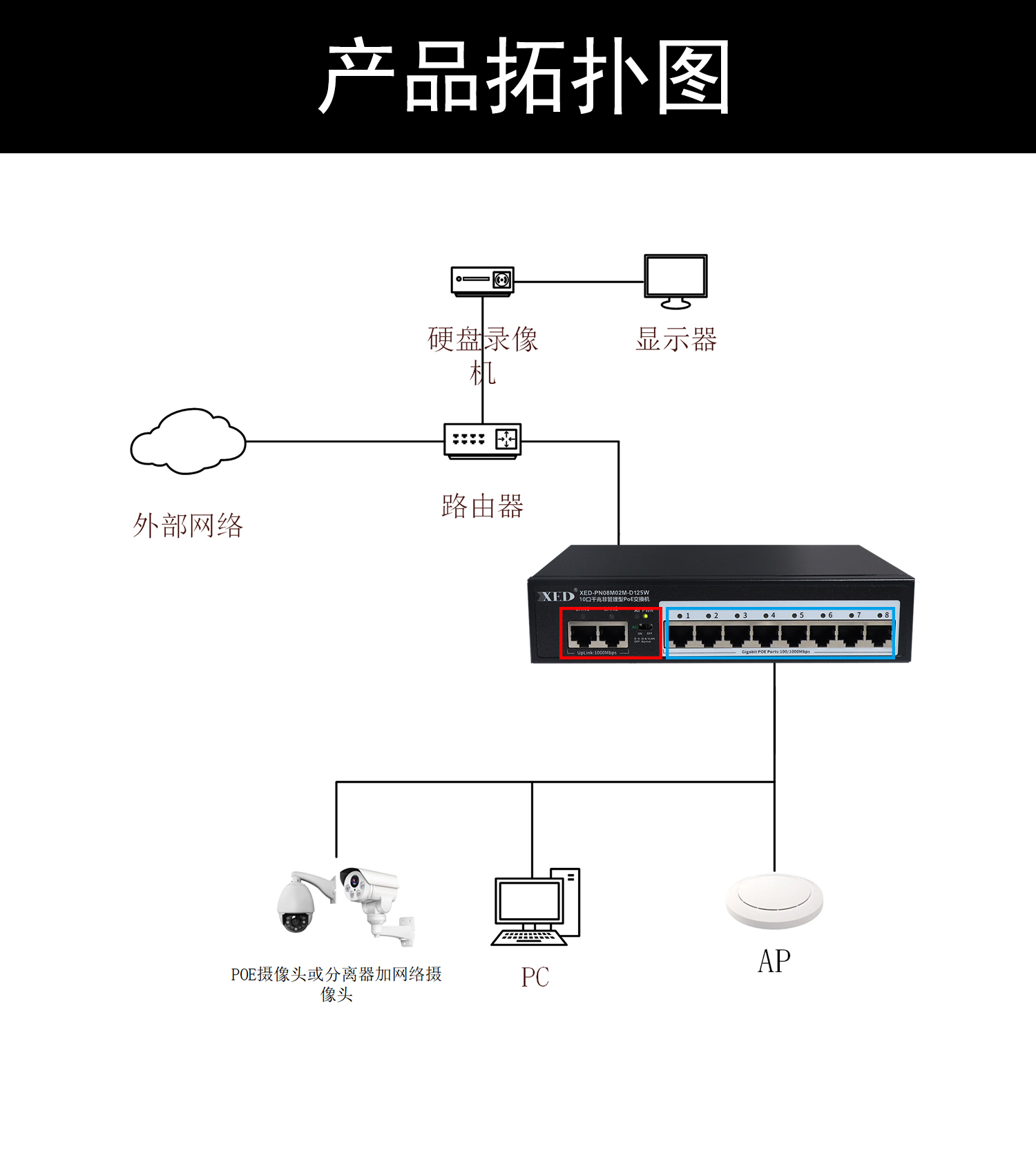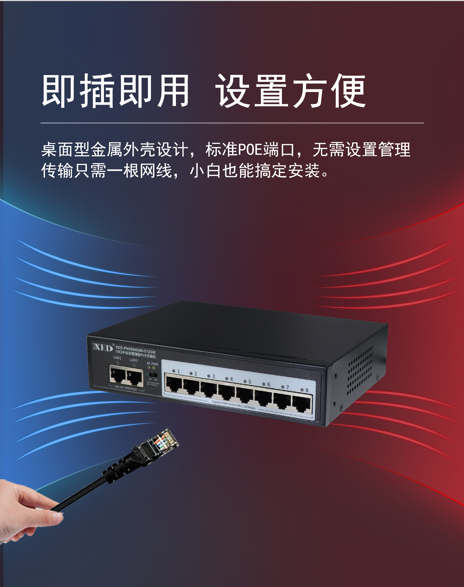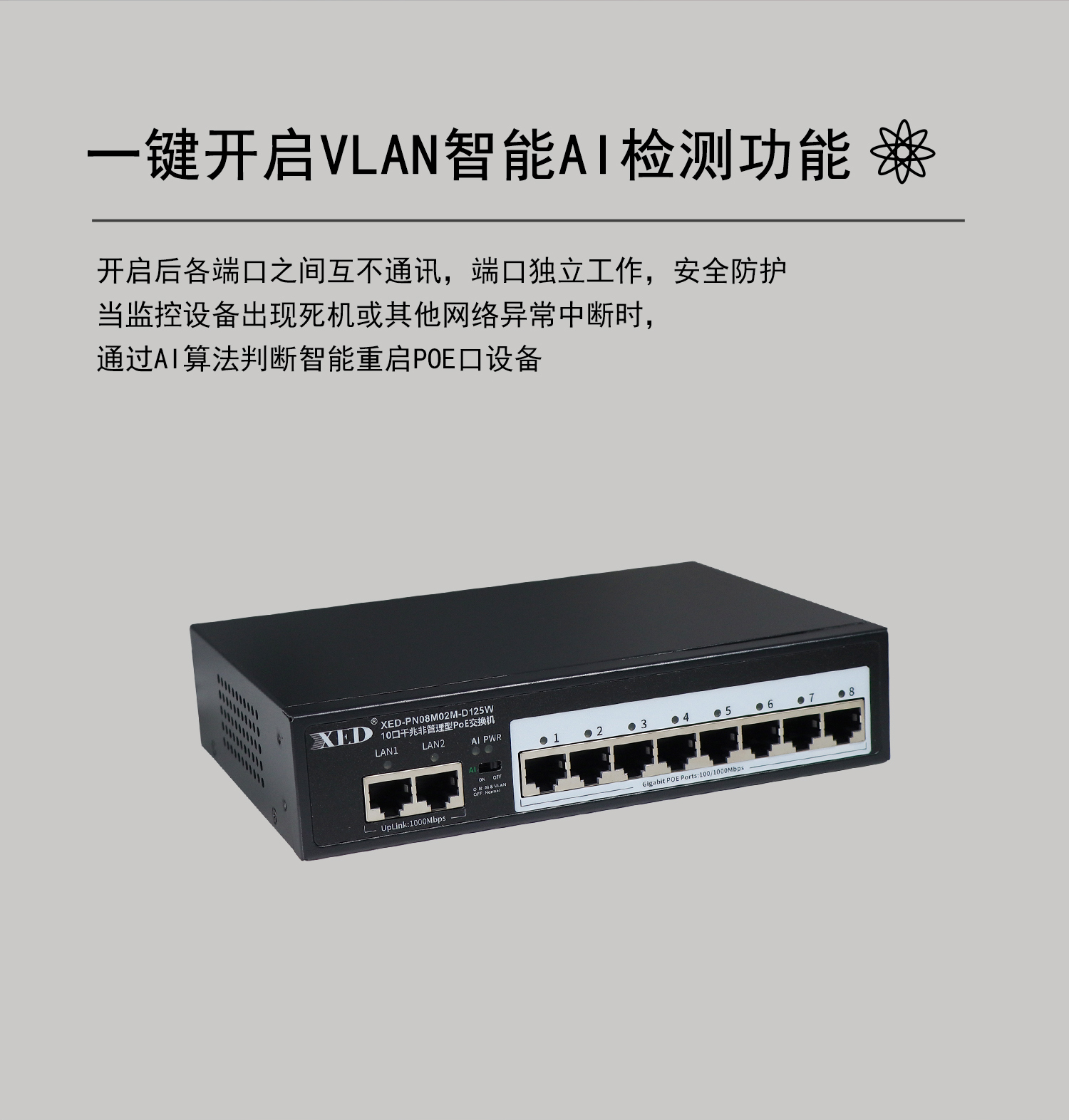 支持8口標(biāo)準(zhǔn)POE輸出,滿載功率125W;