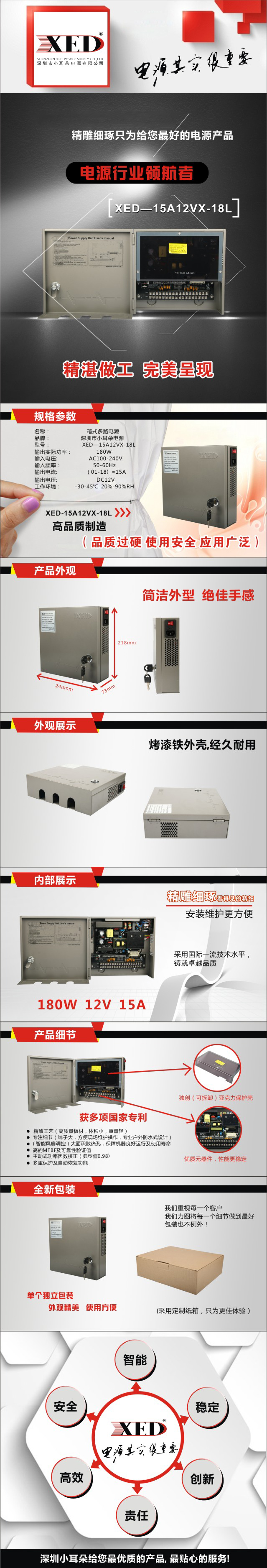XED-15A12VX-18L箱式多路開關電源,18路穩(wěn)壓開關電源,每一路標準足安12V15A,寬電壓AC100-240V輸入,適用室內外多路接入使用。