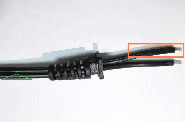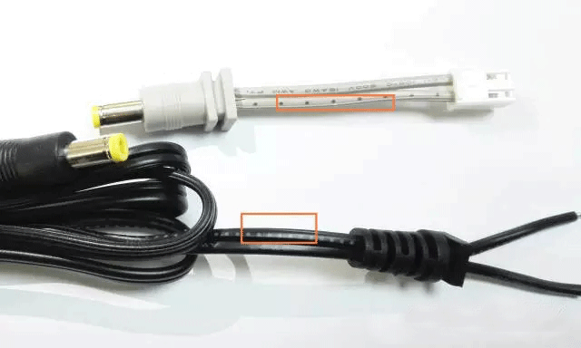 (如下圖)畫圈圈的為正極,線材上有一條虛線;另外一根為負極。