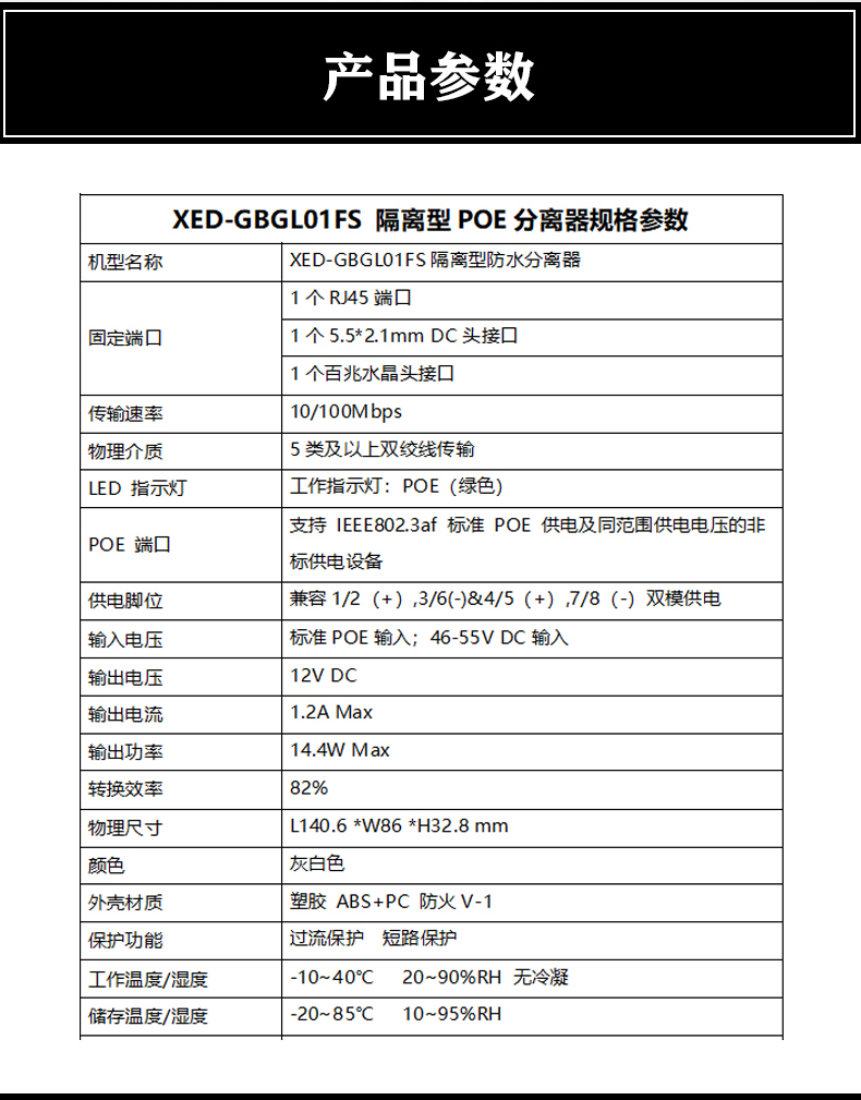 帶隔離的標(biāo)準(zhǔn)PoE分離器,電壓DC46-55V 1.2A。