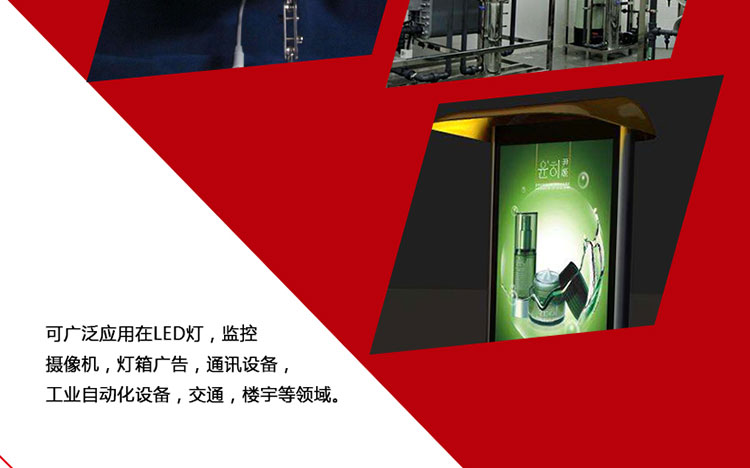 可廣泛應(yīng)用于LED燈、監(jiān)控攝像機(jī)、燈箱廣告、通訊設(shè)備、工業(yè)自動化設(shè)備,交通,樓宇等領(lǐng)域。